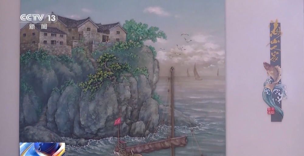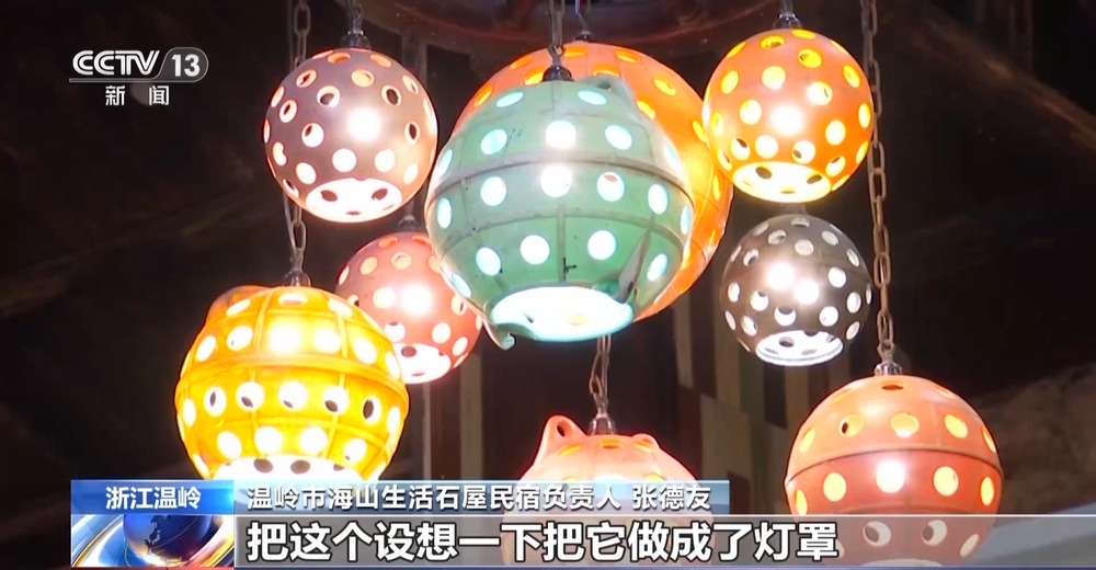 温岭市海山生活石屋民宿负责人 张德友:我们把这个旧船板拿过来给它做成桌子、凳子包括吧台,全部都是旧船板来做的。渔船拖网上面的浮球,当时也因为是废塑料,不可降解,把这个设想一下把它做成了灯罩。比如说这些海洋文化里面要体现螃蟹、梭子蟹的壳,非遗传承人就把它们画成脸谱,我觉得客人到这边来,他不光光是体验一张床的概念,他要体验石塘的这里的一些文化。