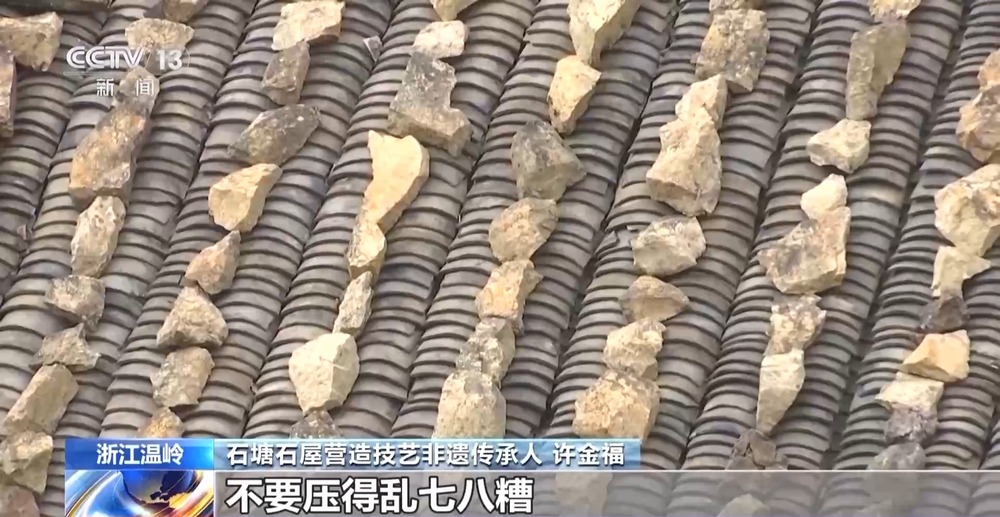 石塘石屋营造技艺非遗传承人 许金福:一般都是两排交界的中线,石头都是压在中间这一排,这样子压起来的防止台风,一般都不会刮掉的,它主要是保持瓦片稳定性。一般压的石头就是压得整齐一点,不要压得乱七八糟,压得好坏要凭师傅的眼光。