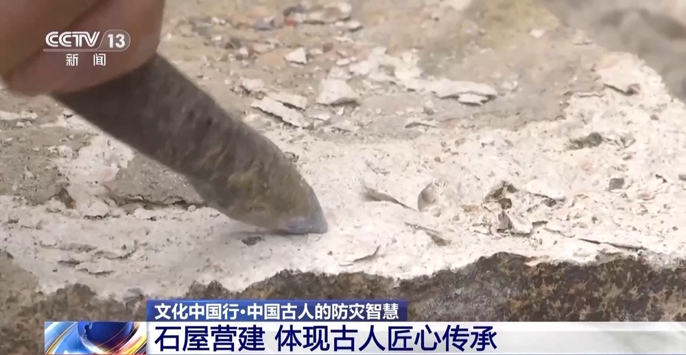 总台央视记者 唐国荣:我这九牛二虎之力敲出火星子来才敲这么大一块儿,看看后面师傅,敲这么大一块儿石头仿佛是敲石如泥。可见这个石屋的建造技艺,不仅需要力道,更需要的是智慧和技艺。